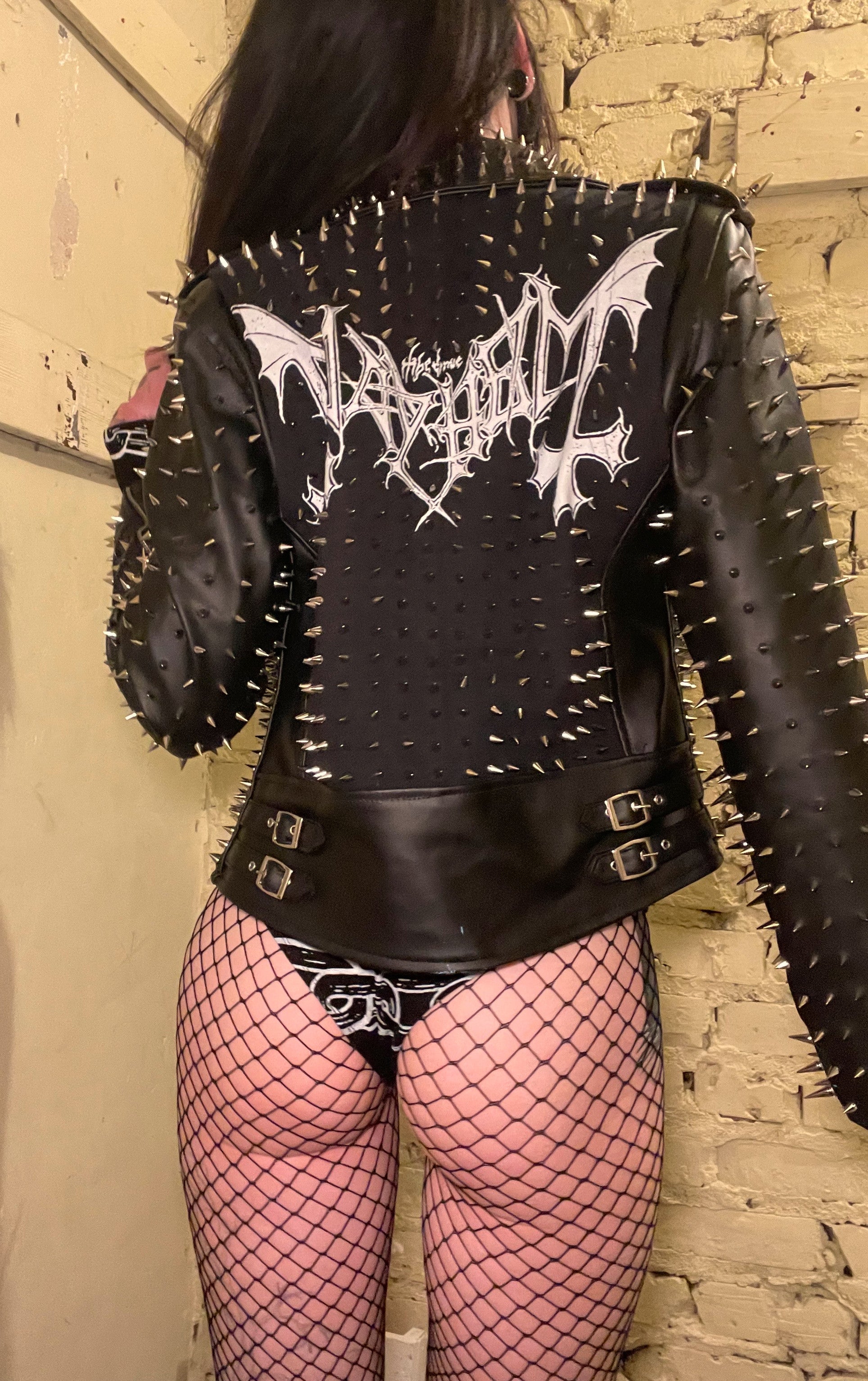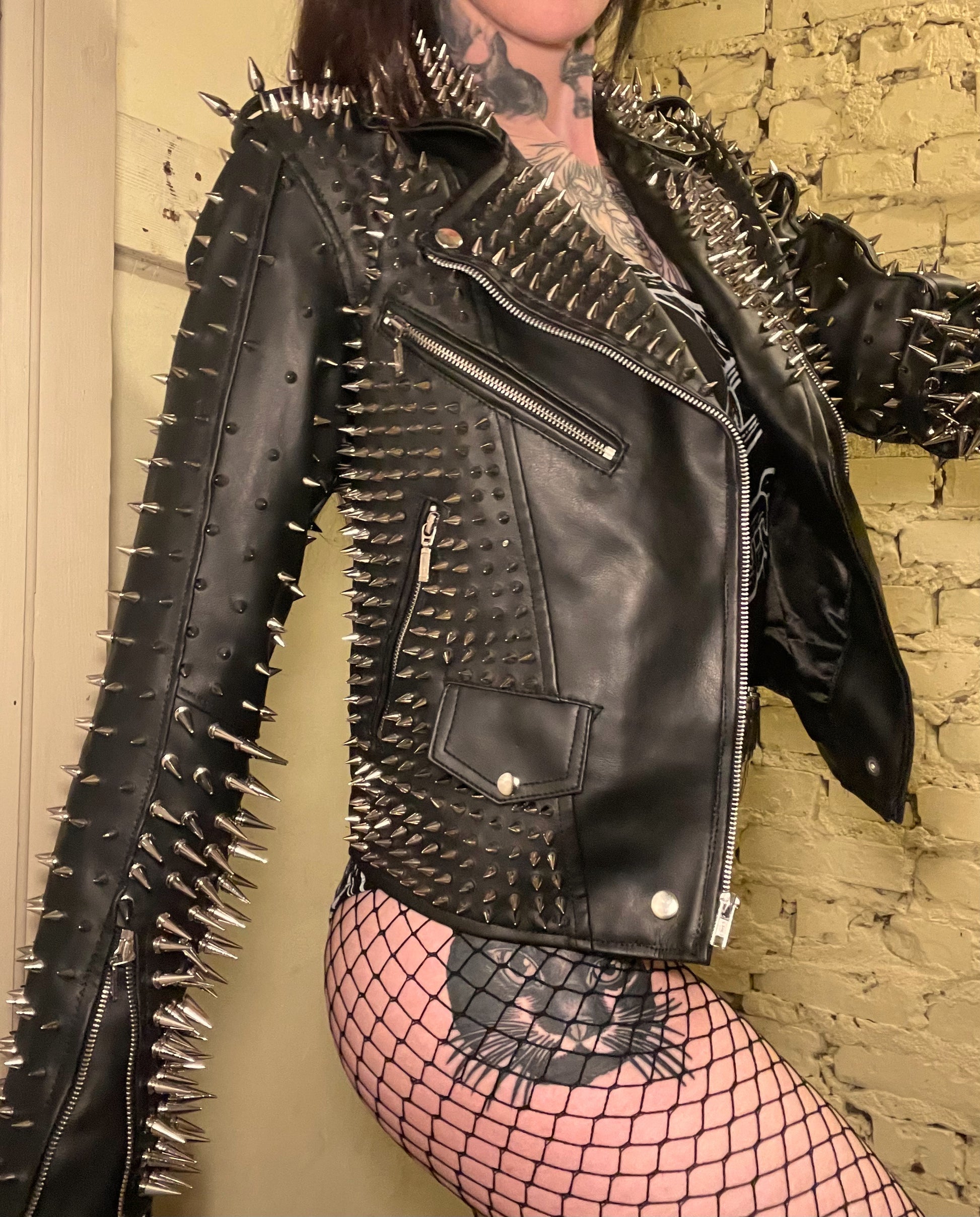 Girls jacket made with premium faux leather and a cotton blend shirt. Design on back with zip closure in front and cuffs with stud detail all over. Fully lined. This jacket is HEAVY