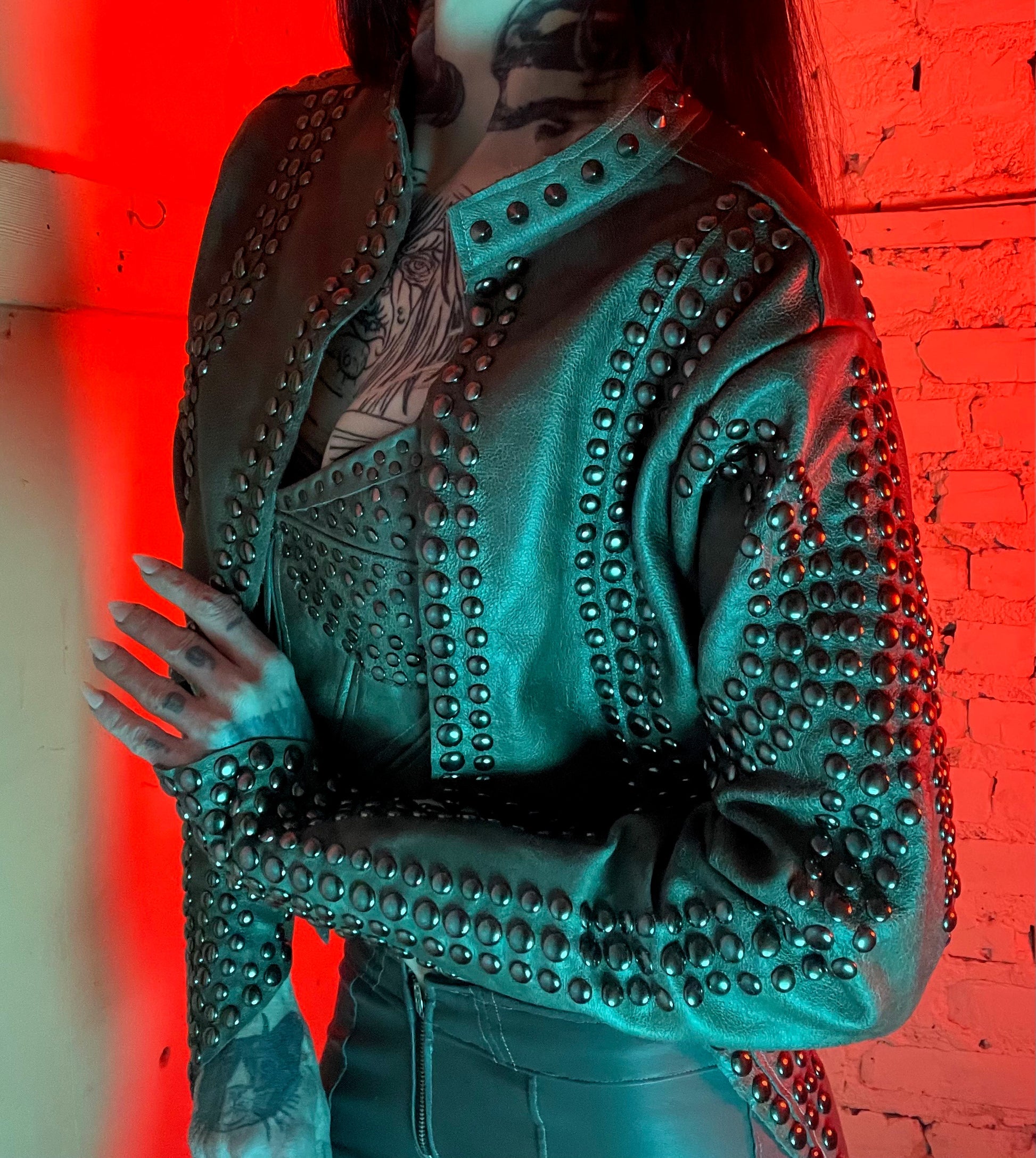 Girls jacket handmade from scratch with heavy gray leather and a cotton blend shirt. Design on back, unlined with charcoal hardware all over.