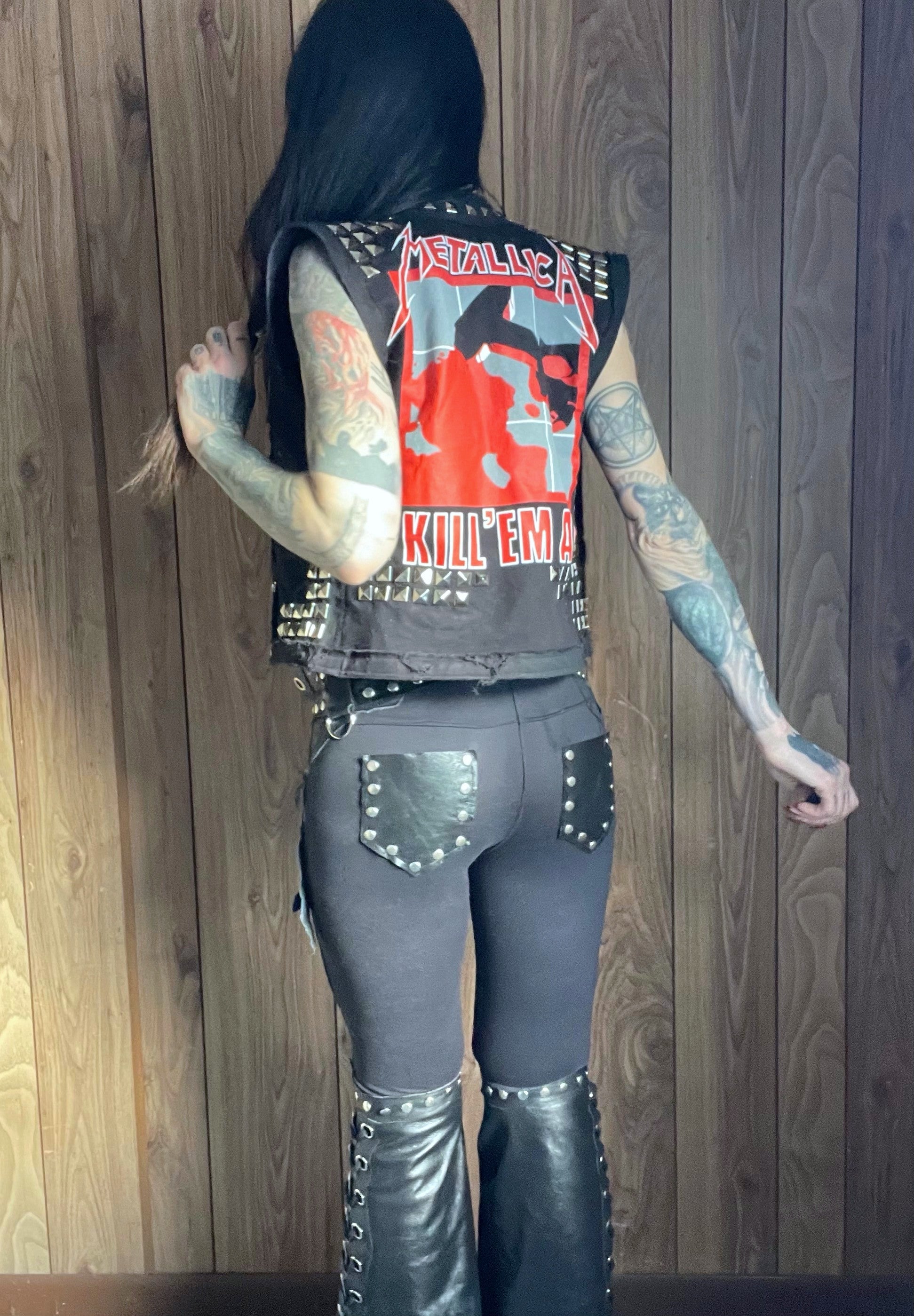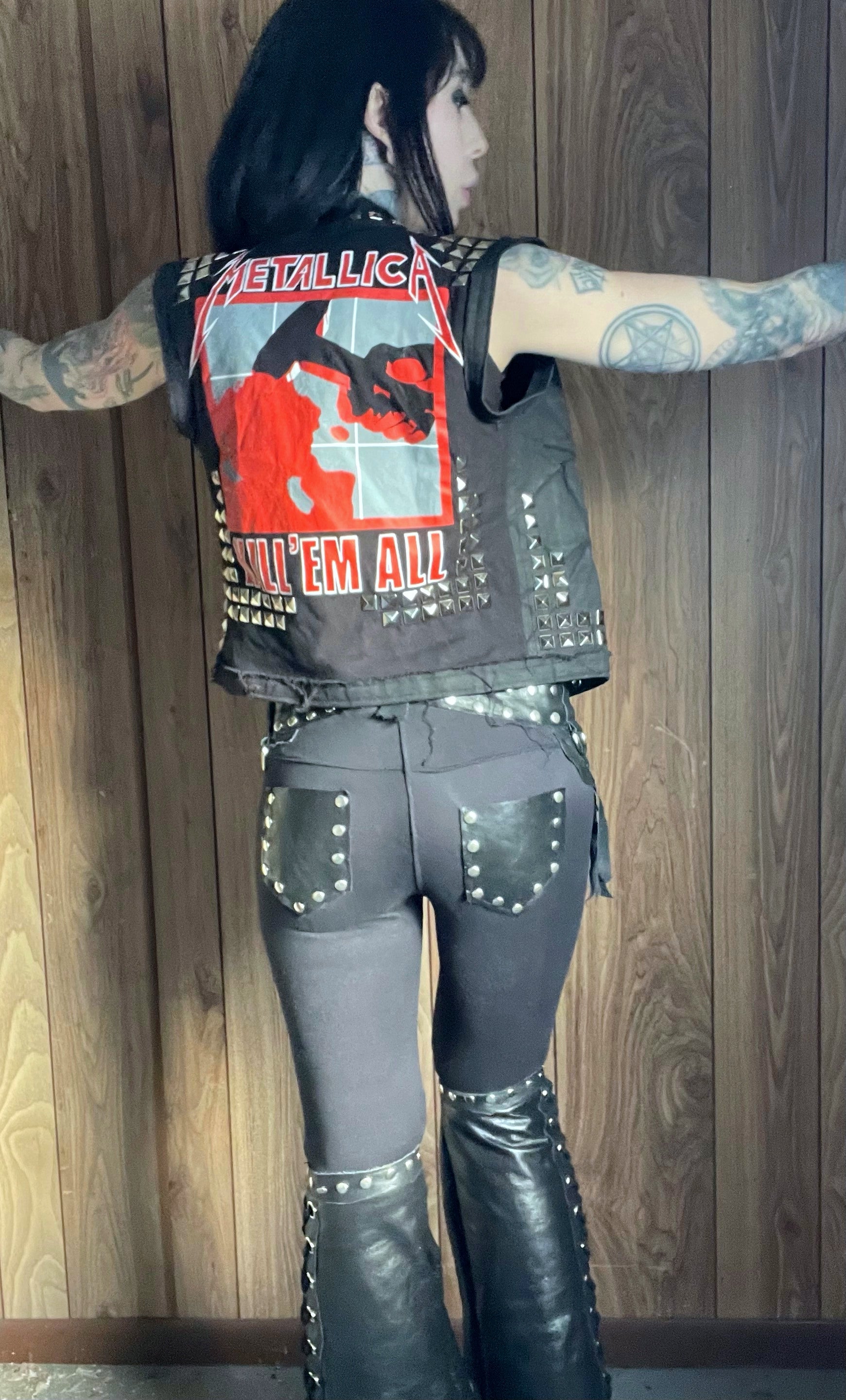 Girls vest handmade from scratch with upcycled denim and a cotton blend shirt. Hand waxed with design on back, snap closure, frayed trim and silver stud detail.