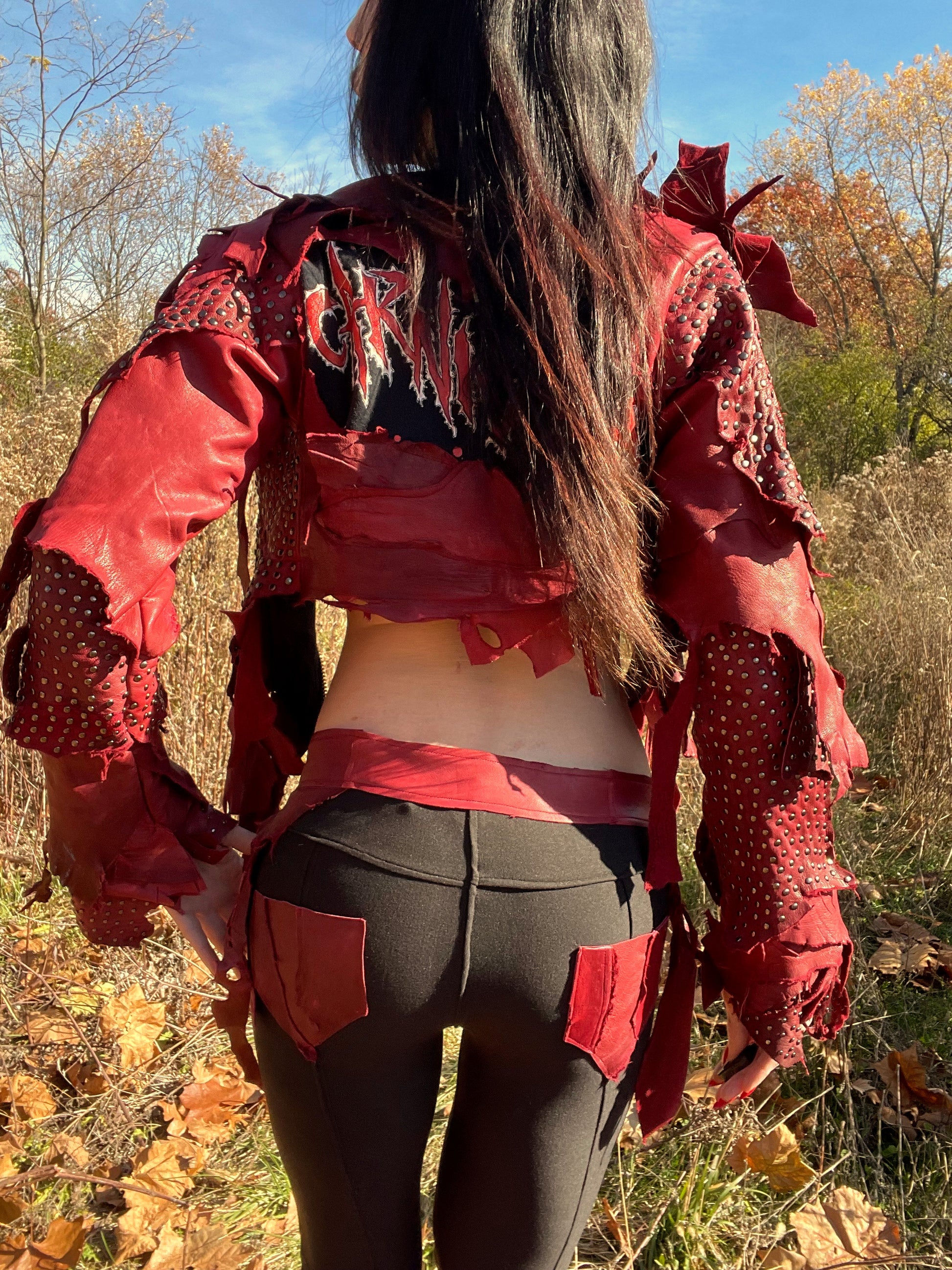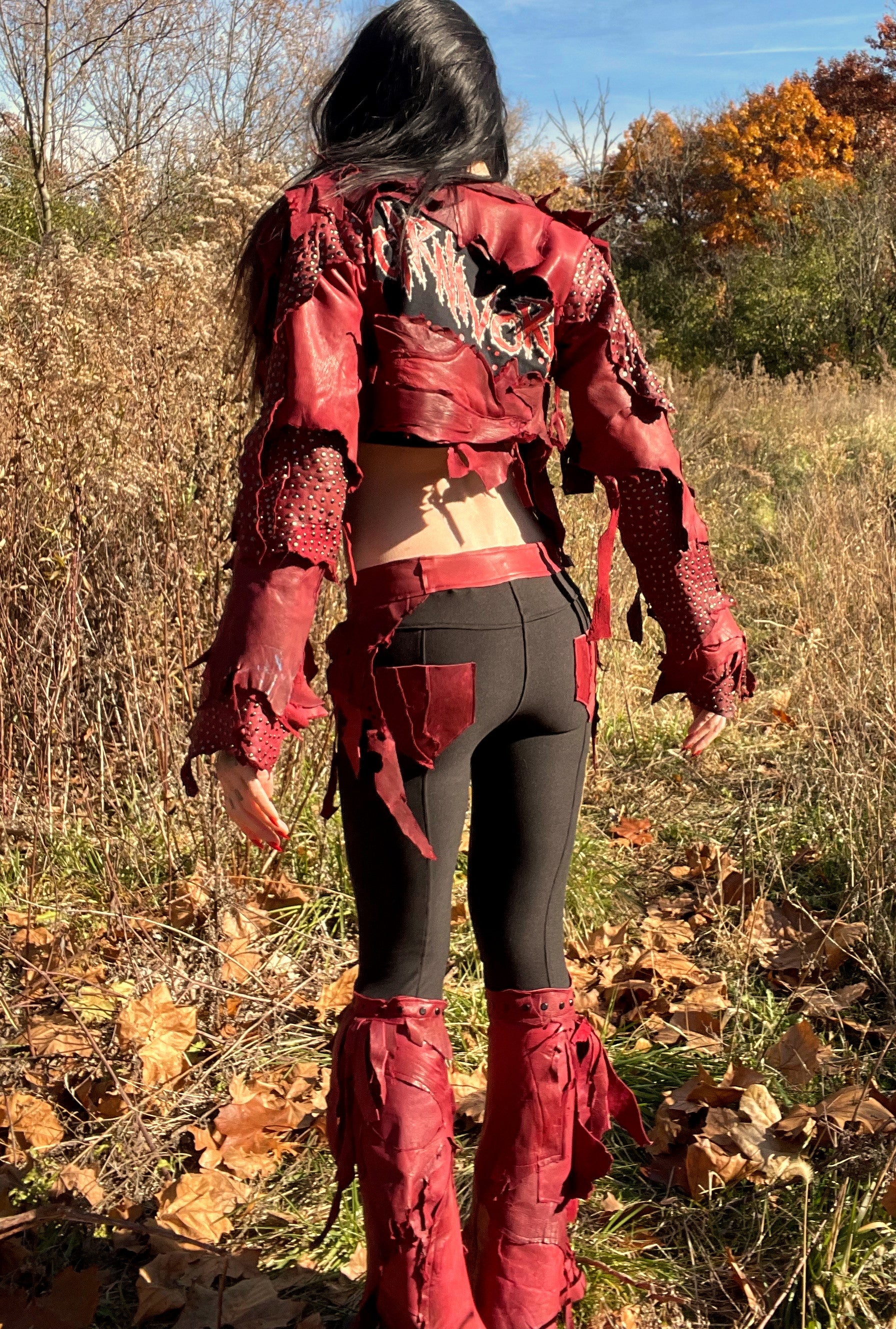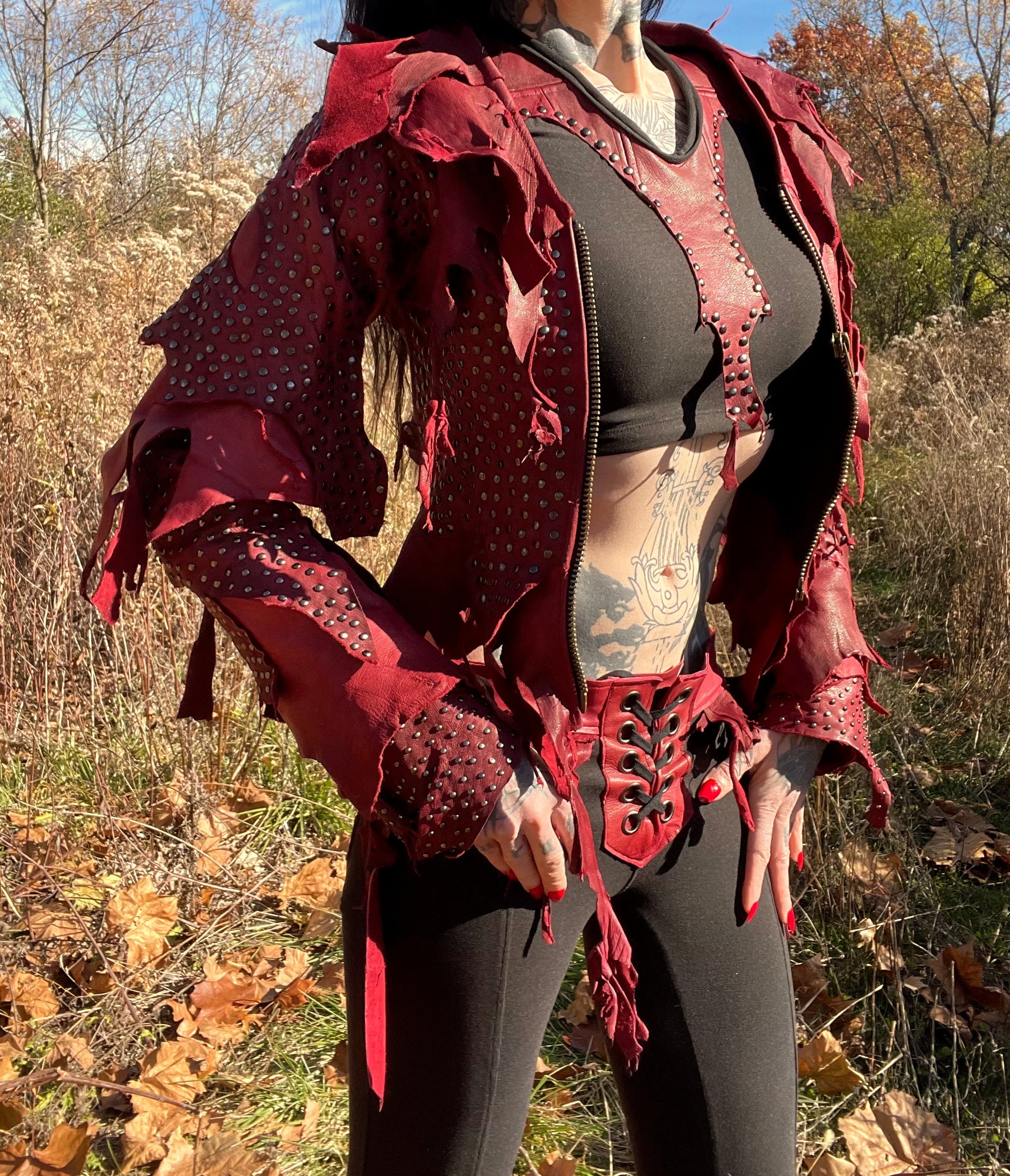 Girls jacket made with a cotton blend shirt and blood red leather. Design on back with zip closure in front, fully lined with layers of raw leather and charcoal hardware all over.
