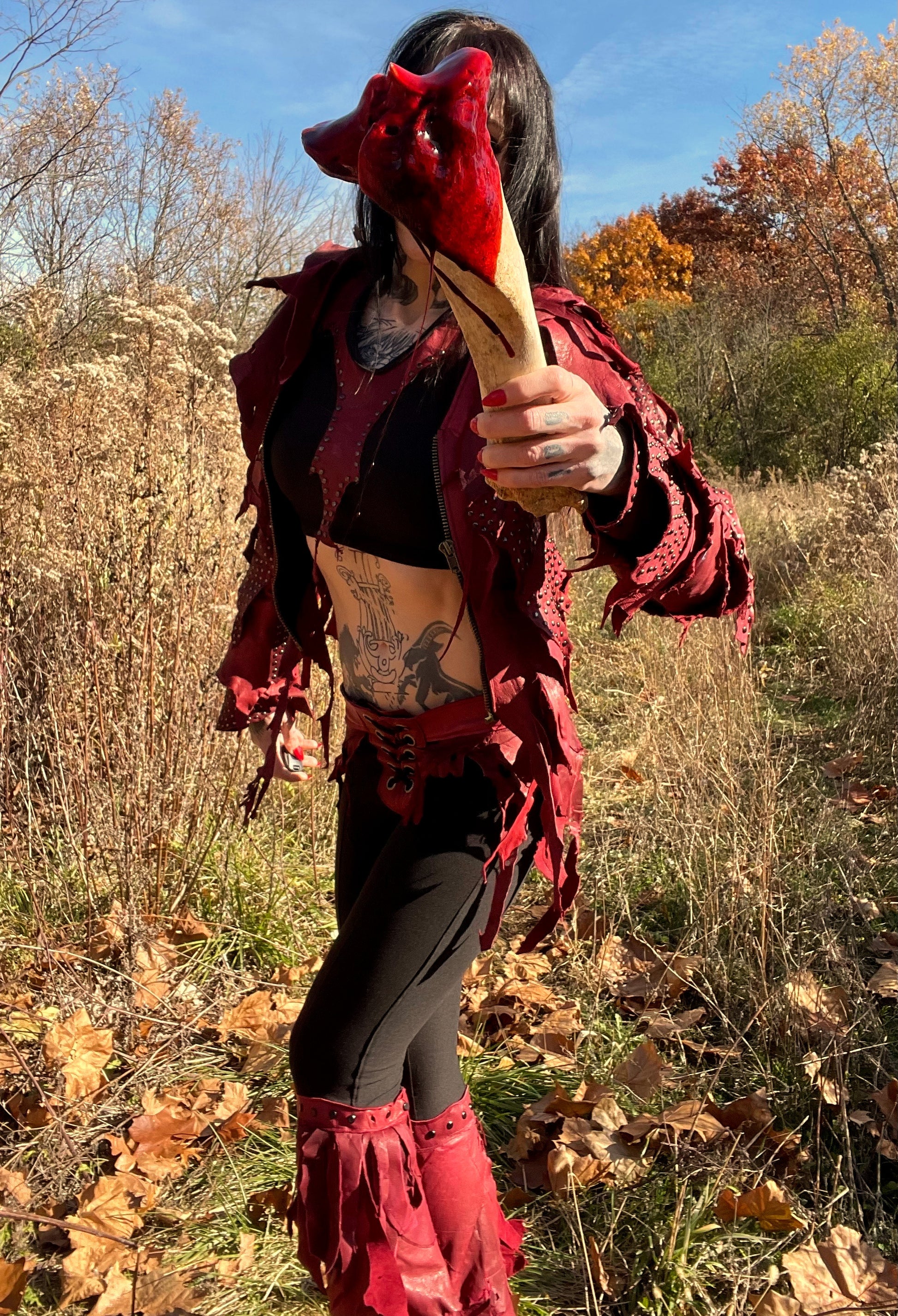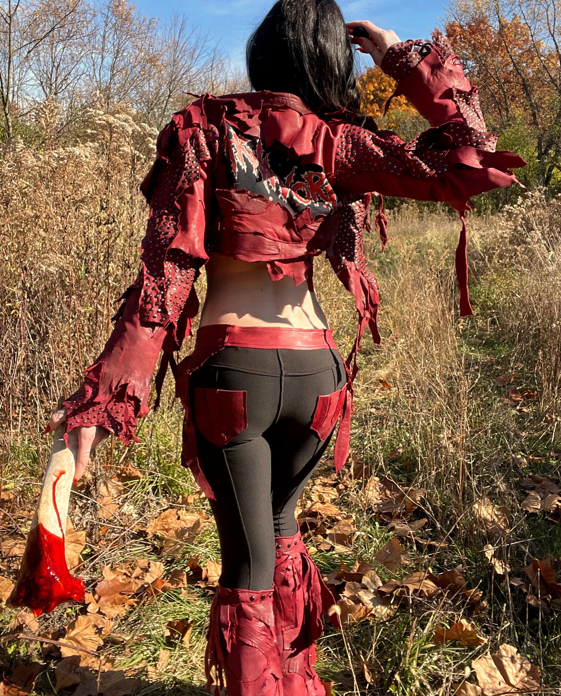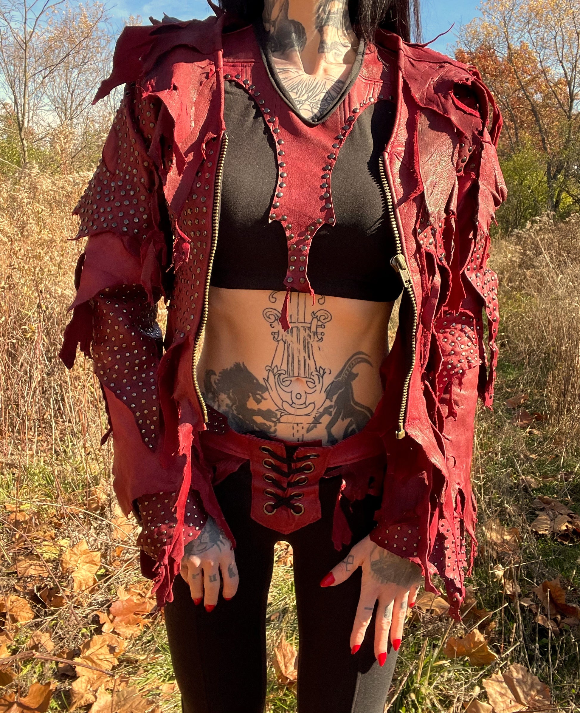 Girls jacket made with a cotton blend shirt and blood red leather. Design on back with zip closure in front, fully lined with layers of raw leather and charcoal hardware all over.