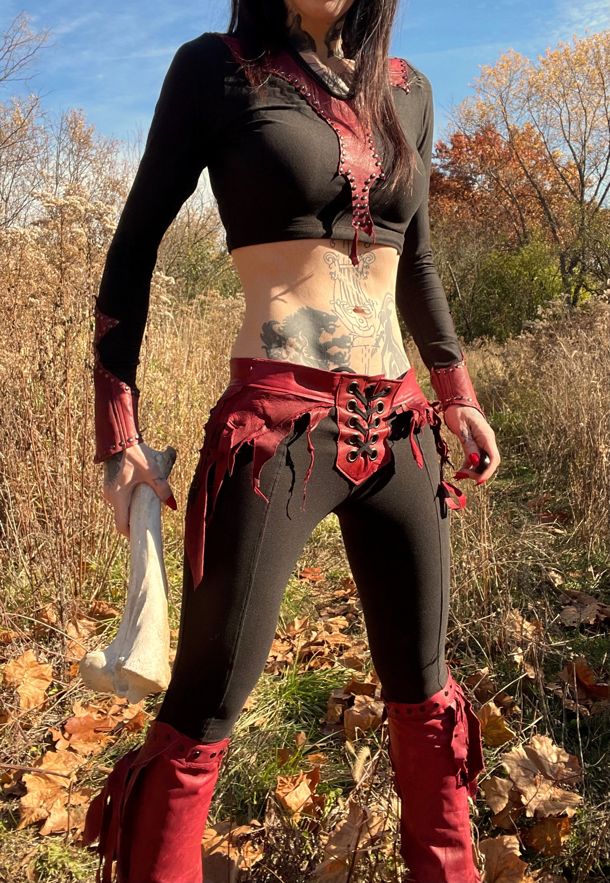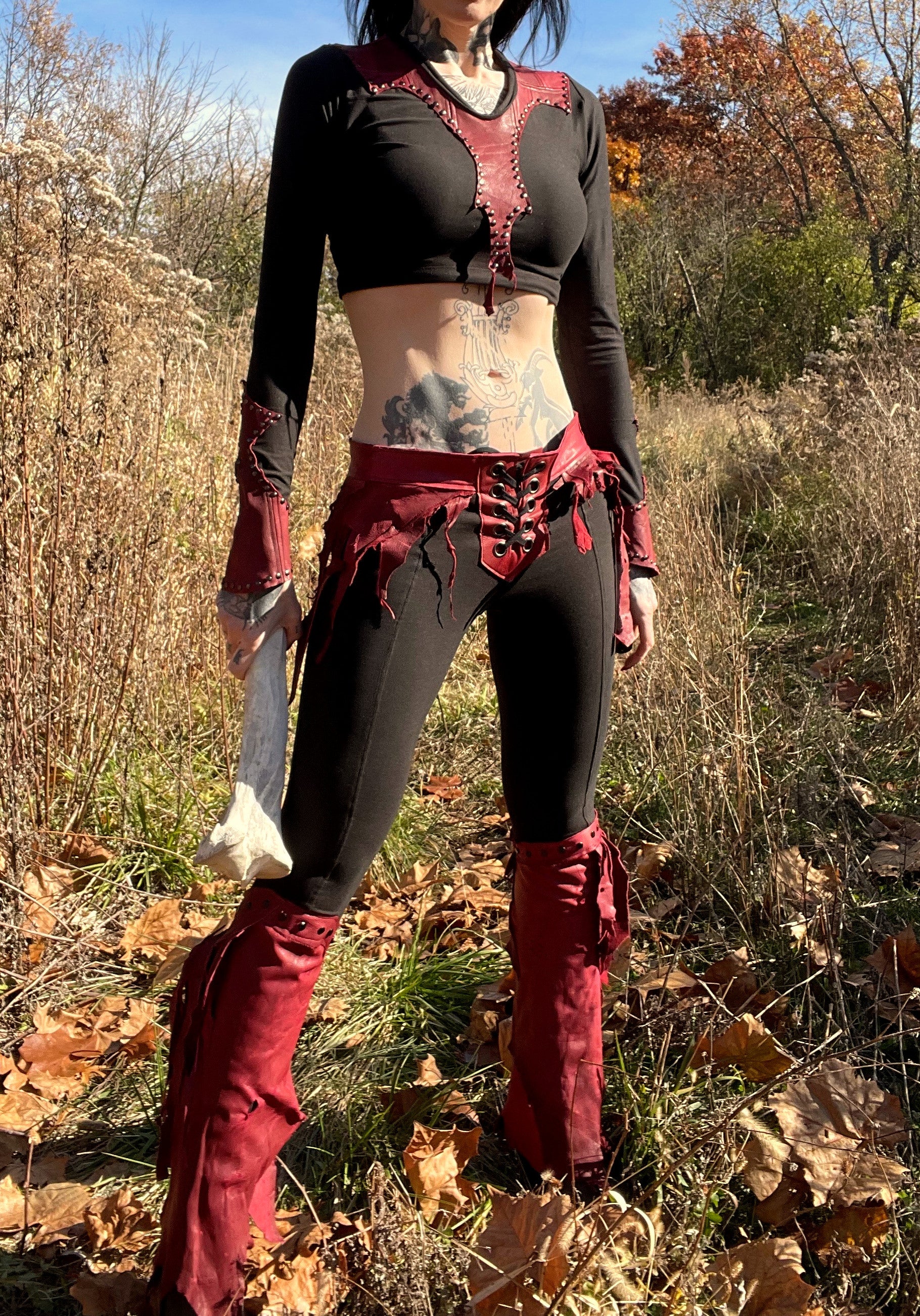 Girls pants handmade from scratch with black milliskin and leather. Low waistband with lace up crotch, super soft and stretchy with leather pockets and blood red raw leather detail all over with charcoal hardware.