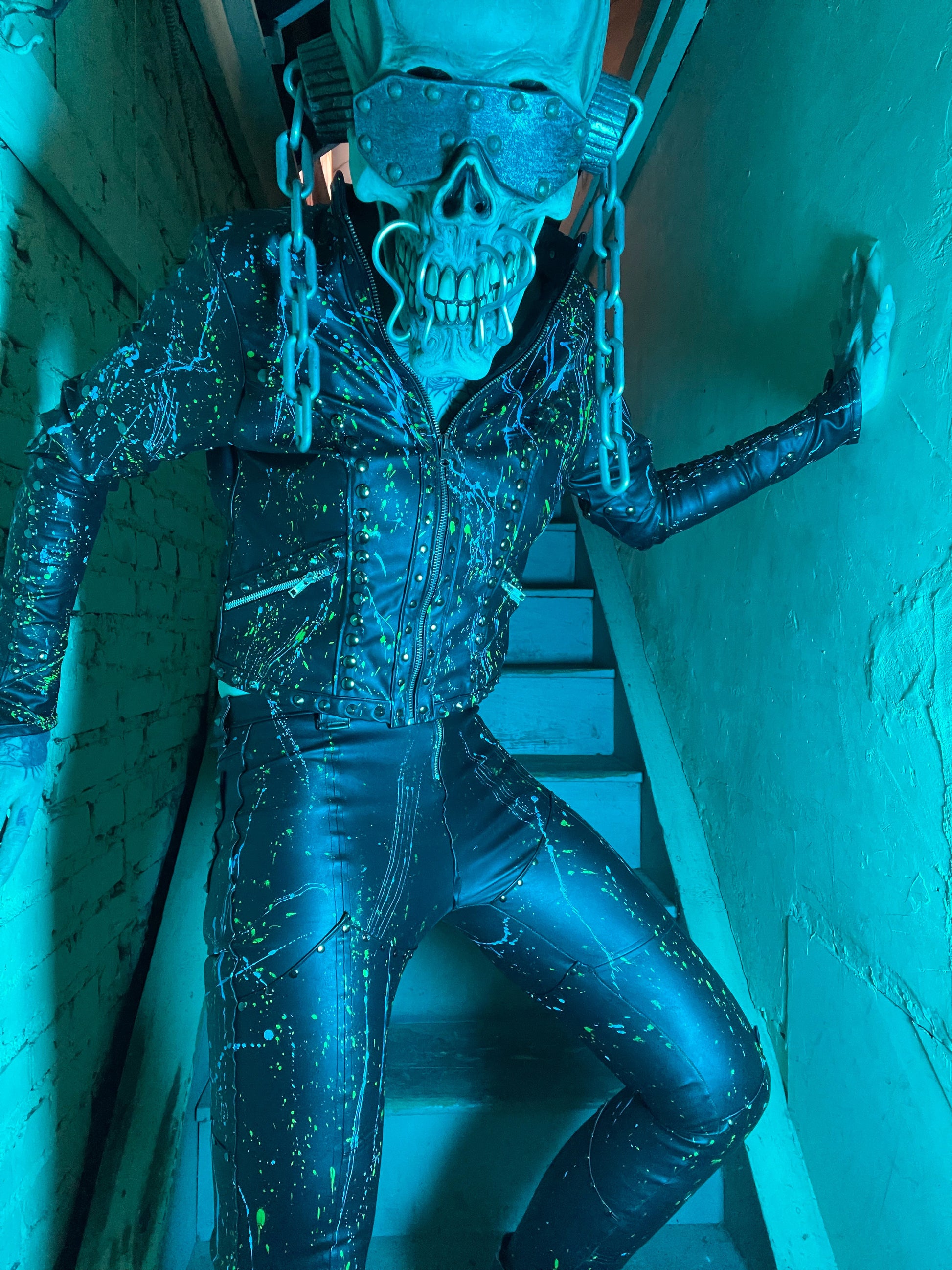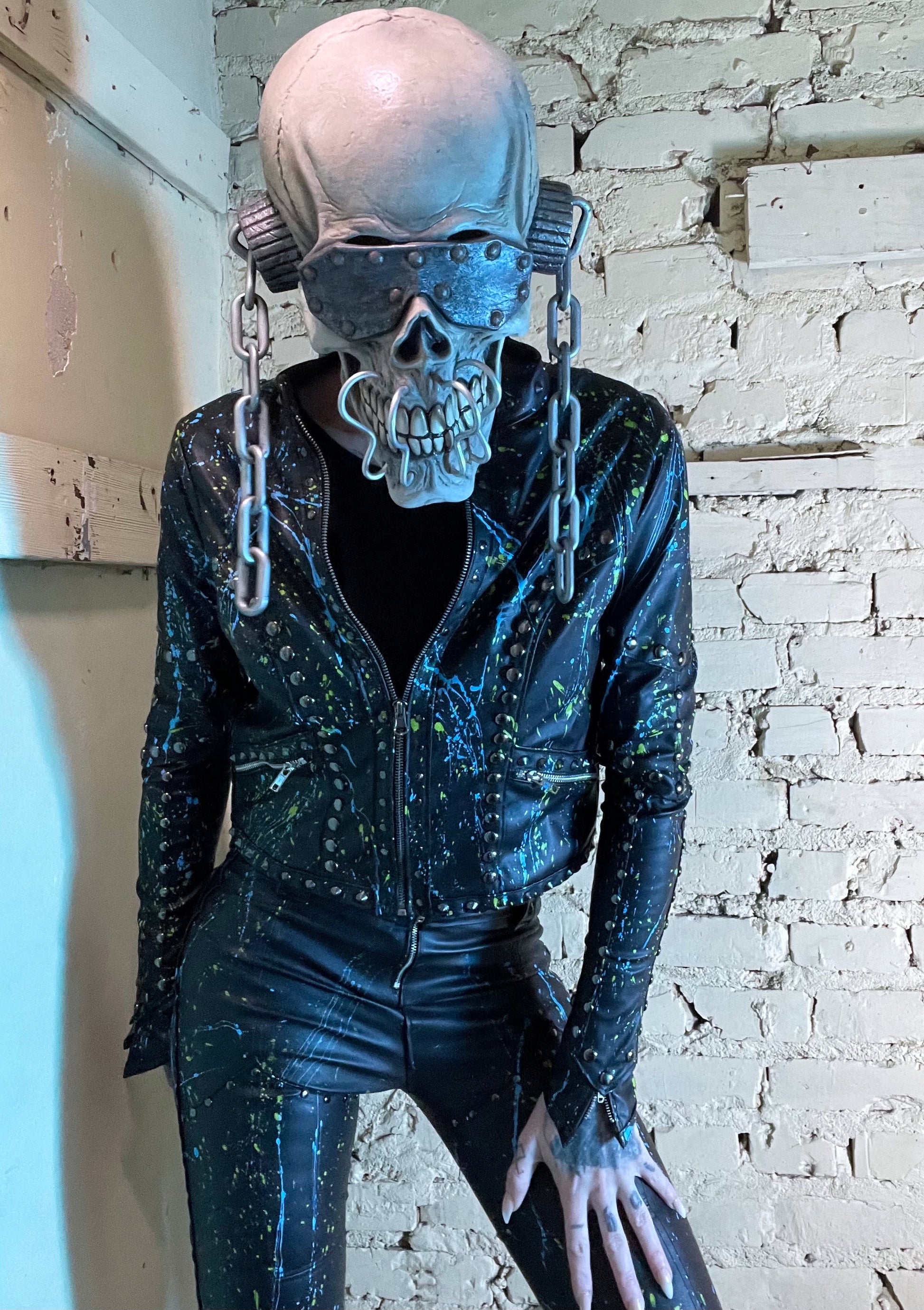 Girls pants handmade from scratch with black stretch pleather. High waistband with zip crotch, charcoal stud detail and neon lime green and electric blue splatter all over.