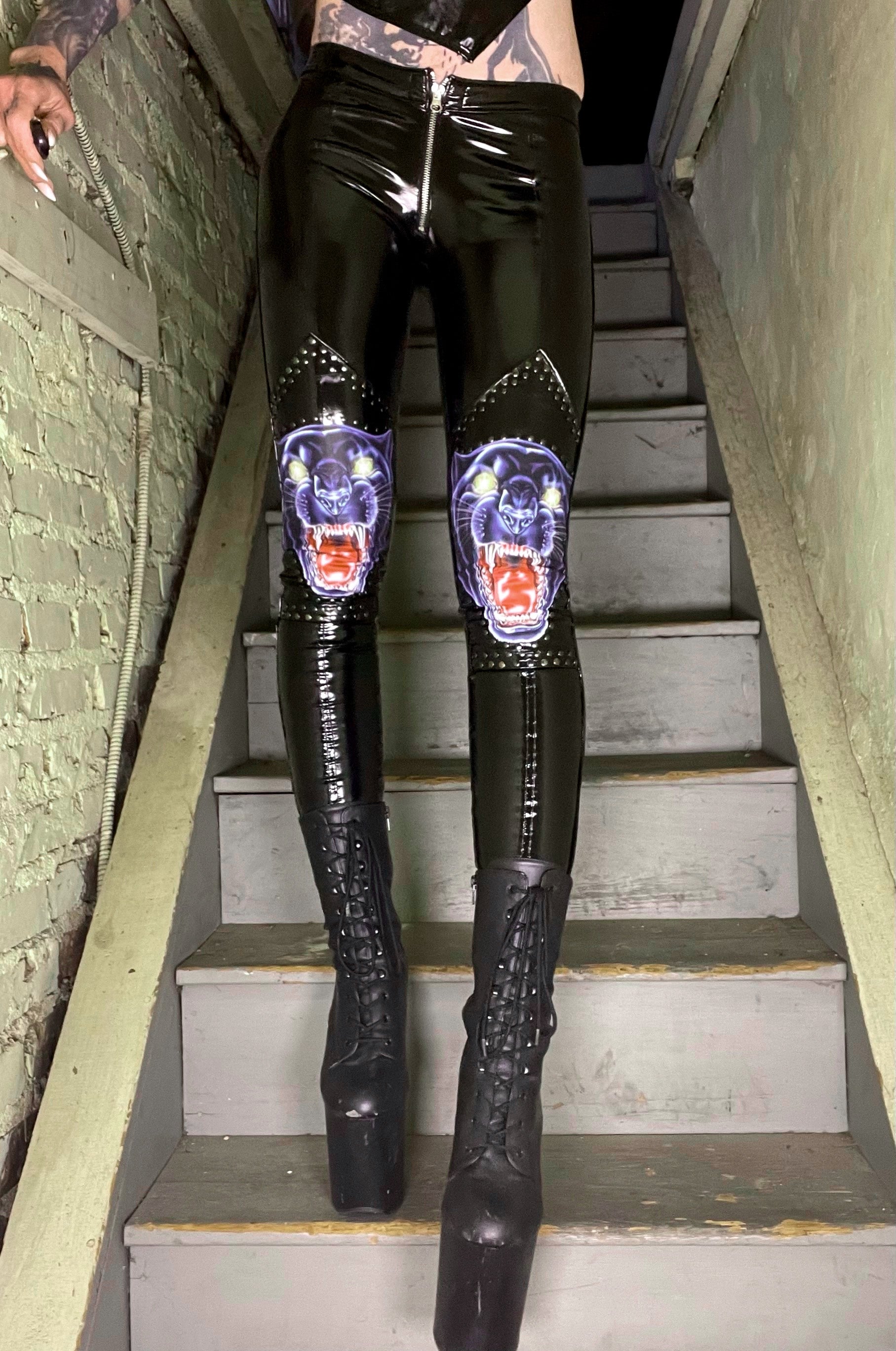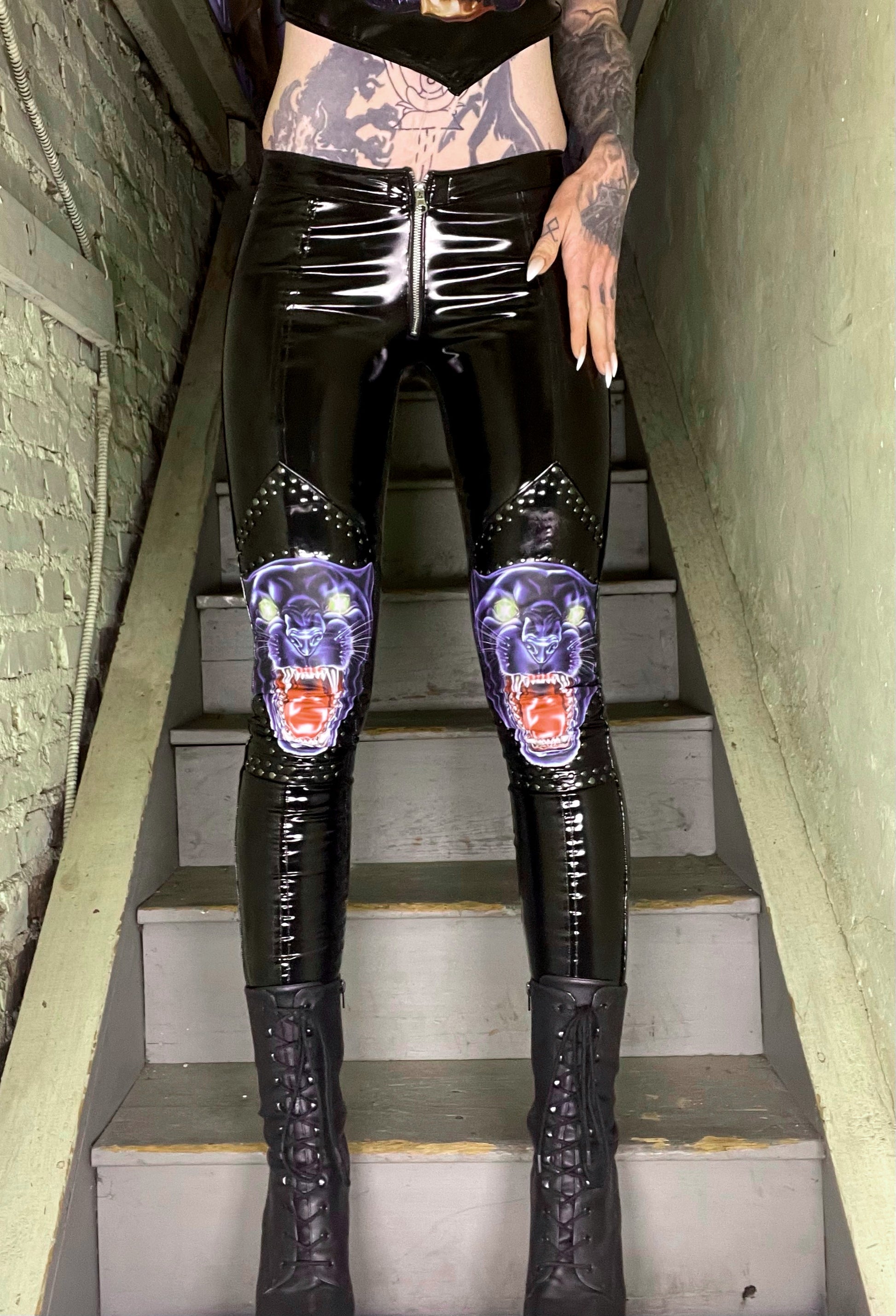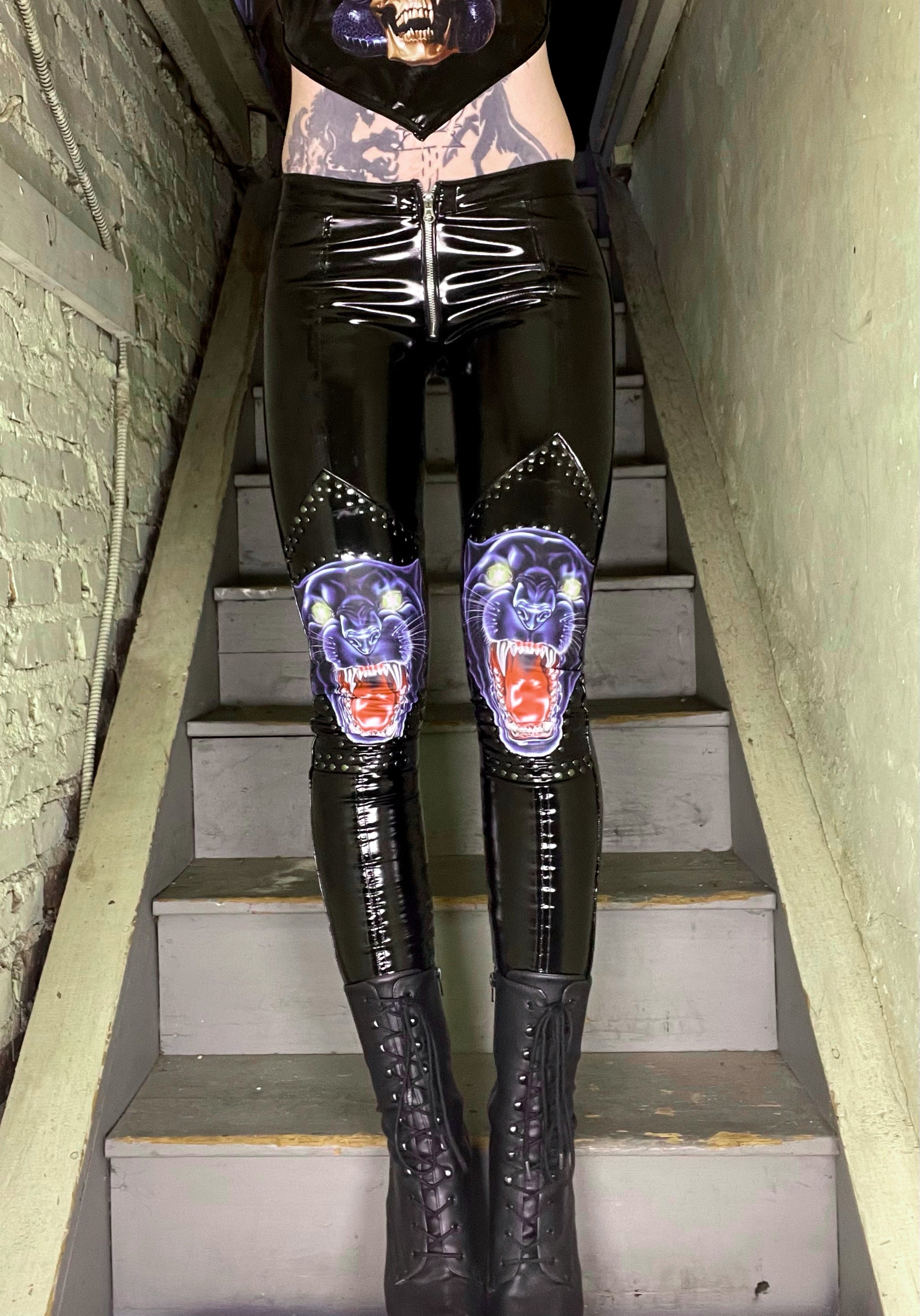 Girls pants handmade from scratch with black 4-way stretch vinyl. Low waistband with zip crotch and design on knees with charcoal stud detail.