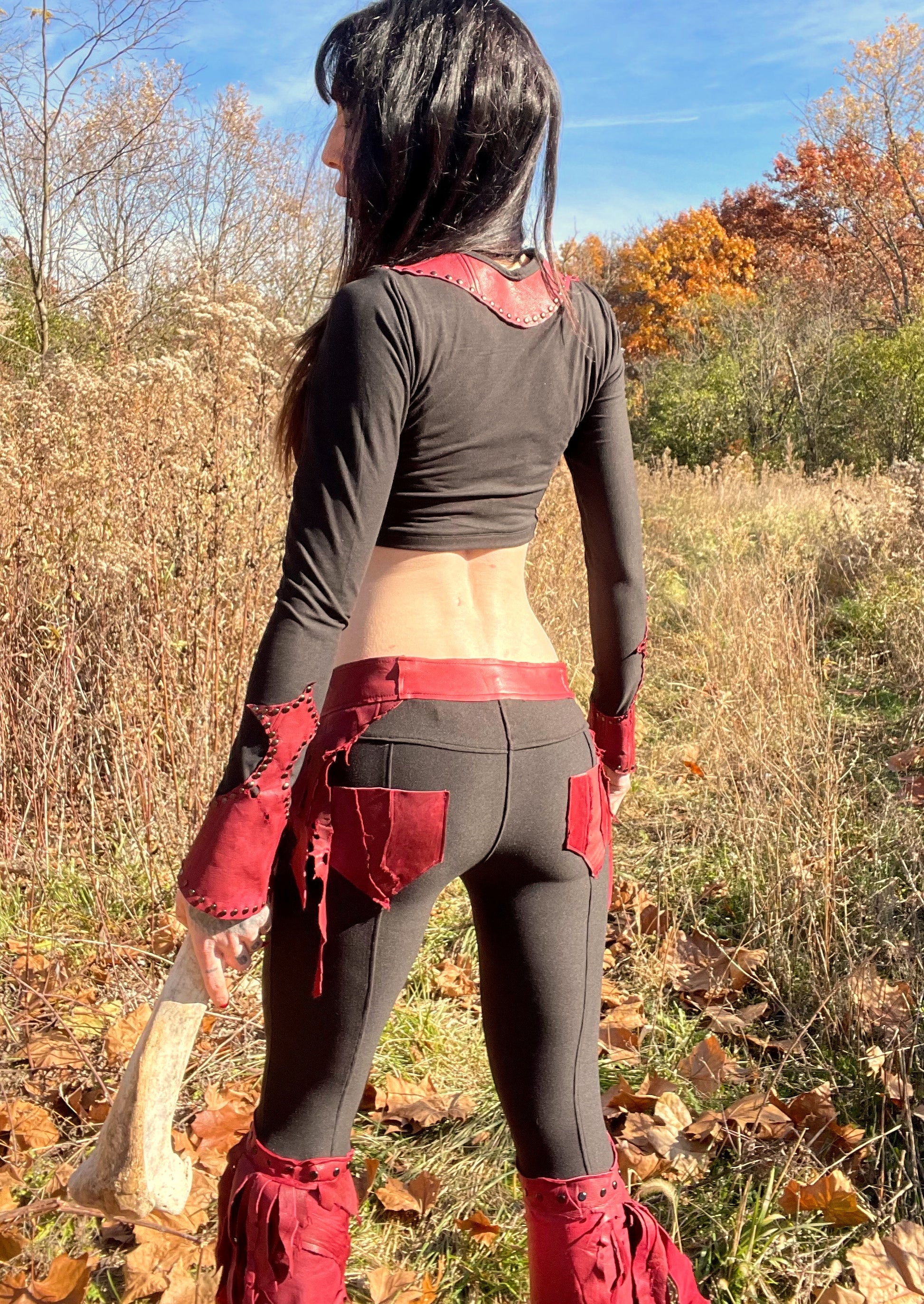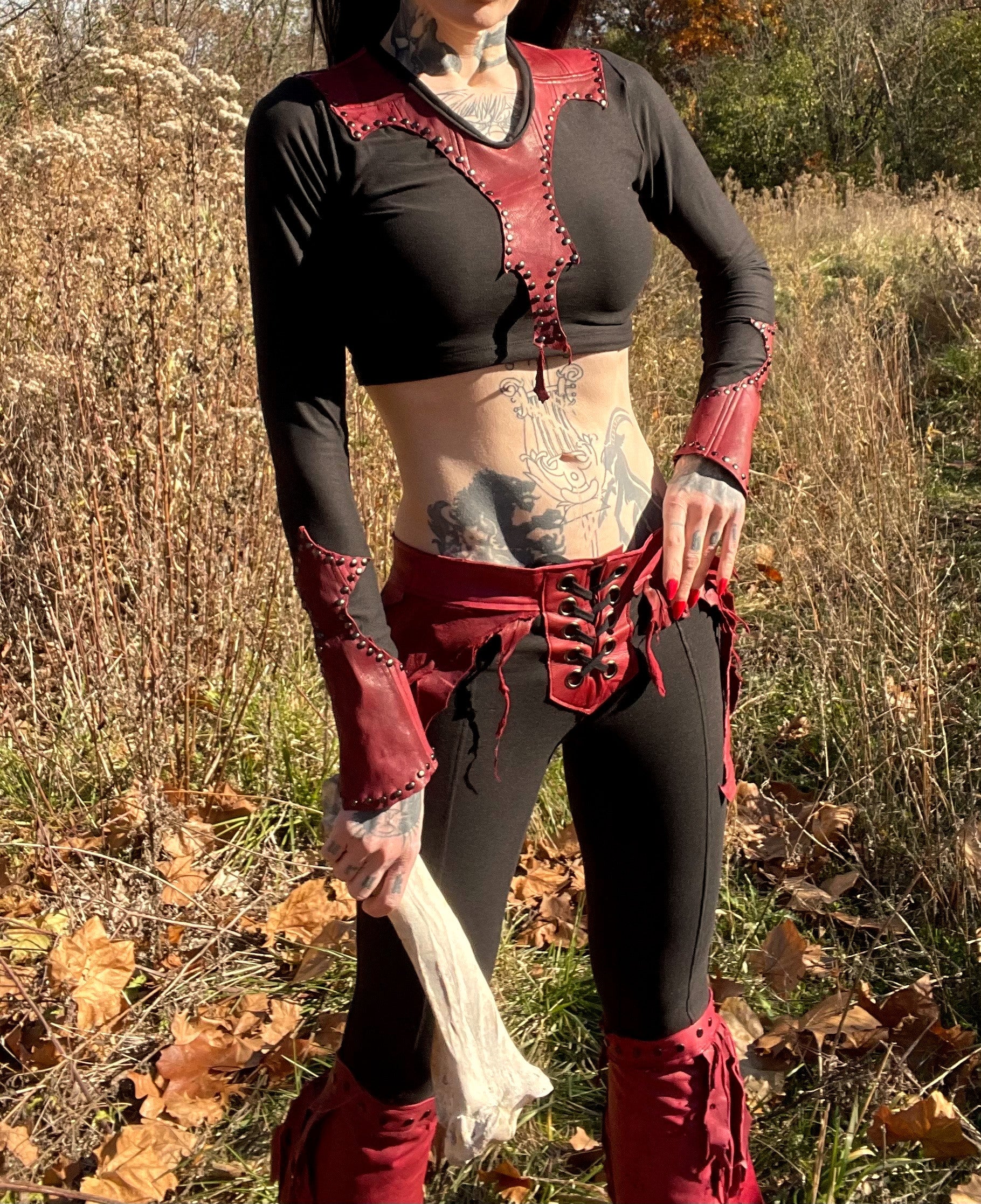 Girls top handmade from scratch with black milliskin and dark red leather. Red leather cuffs and yoke with charcoal hardware and tons of stretch.